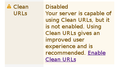 - Add a section to the status report. That was the first thing I checked when I was having the problem. There should be a warning if mod_rewrite is not enabled but clean urls are. This is perhaps the simplest solution.