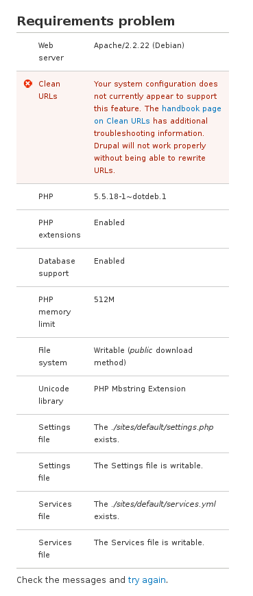 This patch however blocks the installation from continuing even if someone wanted to keep using dirty urls due to their setup. Is this the case? Can someone confirm if Drupal 8 is supporting systems without clean url support? Is the form system broken completely if they are disabled? If there is no support the error and the documentation page should be clearer about this.