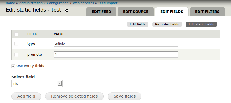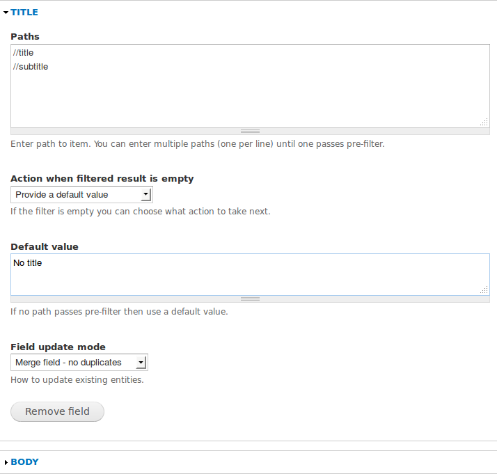 Edit imported fields. Fields are mapped using source path format. All paths are relative to parent (if parent path exists in source configuration).