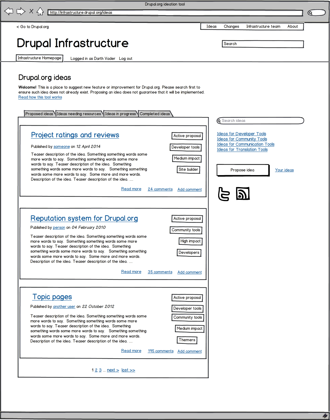 - In 2012, webchick ran an ideation process through an external service called IdeaScale at http://drupal-association.ideascale.com/ to try and get a general pulse on what people were thinking. 130 ideas were posted, 524 comments, 4114 votes from 408 users.