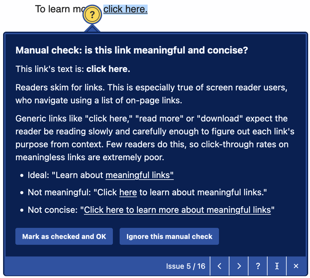 - Links to PDFs and other documents, reminding the user to test the download for accessibility or provide an alternate, accessible format