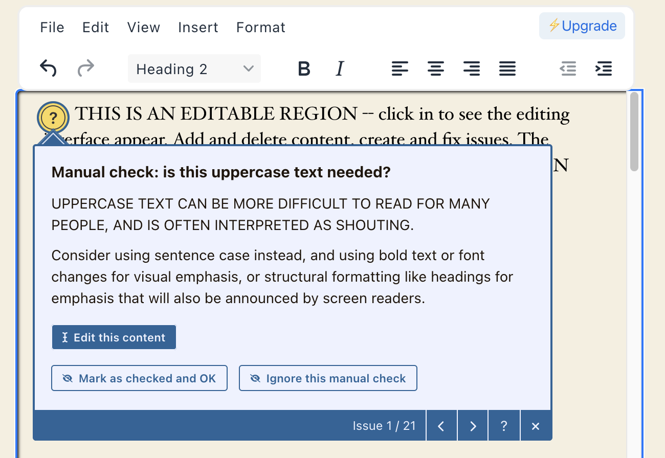 - It focuses exclusively on content issues: inserting alerts and tooltips to assist authors at fixing the things that are their responsibility, without confusing or annoying them with code or theme issues. Editoria11y is meant to supplement, not replace, testing with comprehensive tools and real assistive devices.