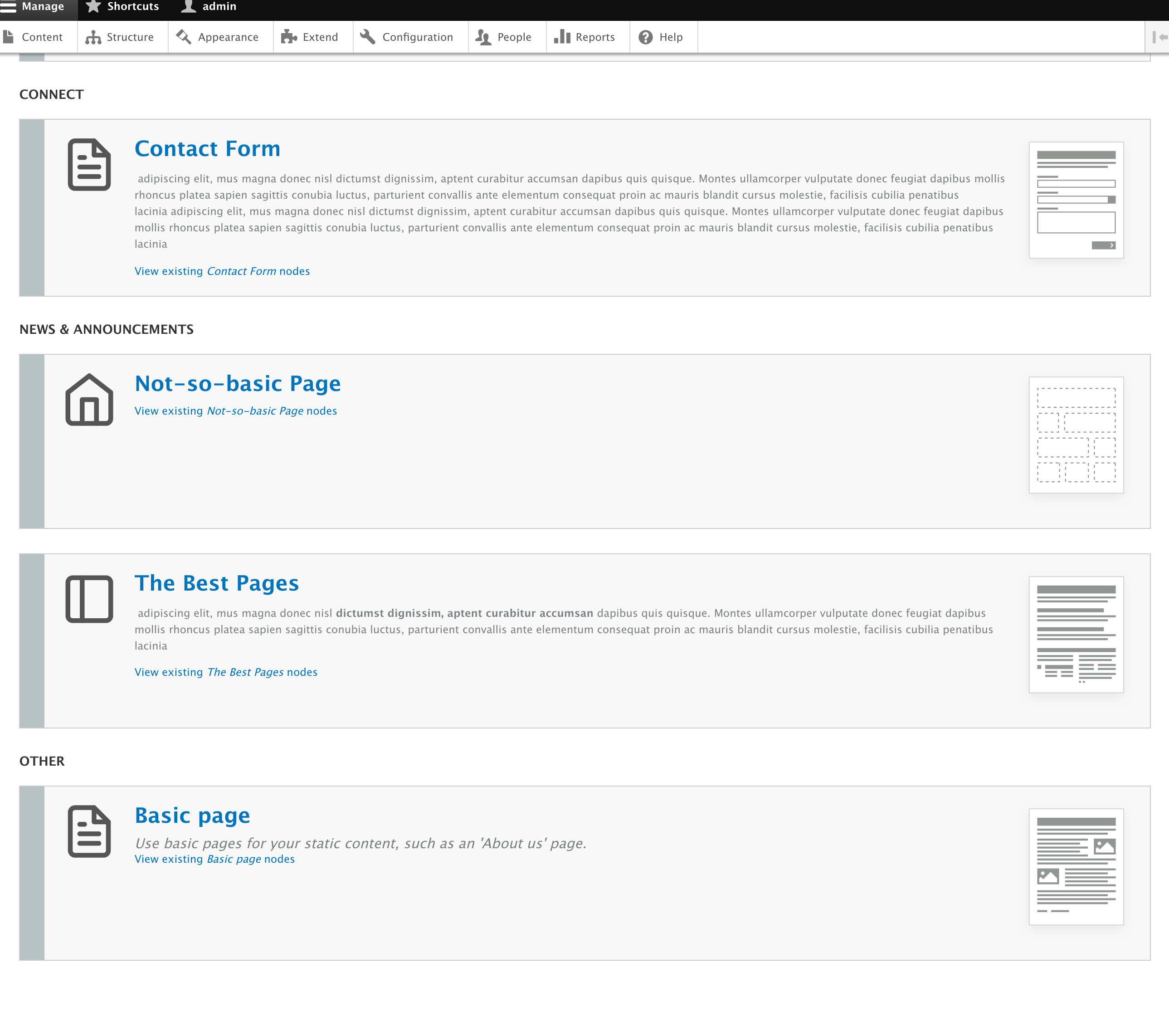 This module helps sites with a large number of content types to improve the usability of the Content -> Add page.