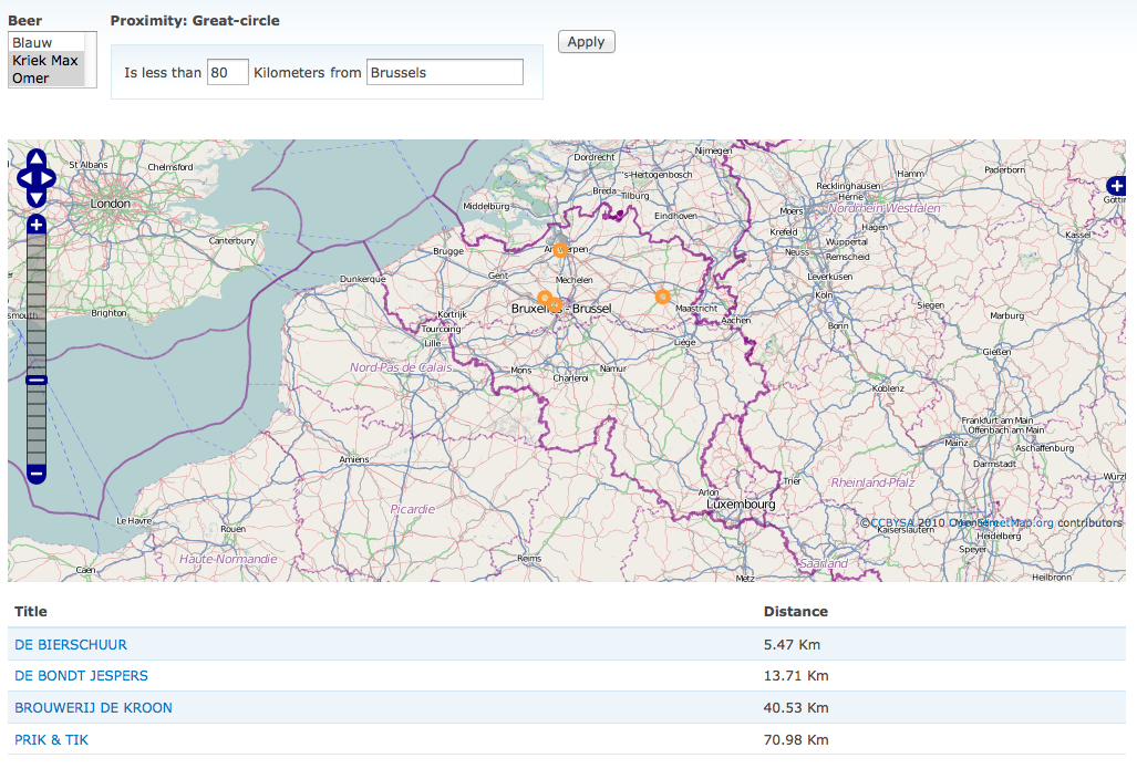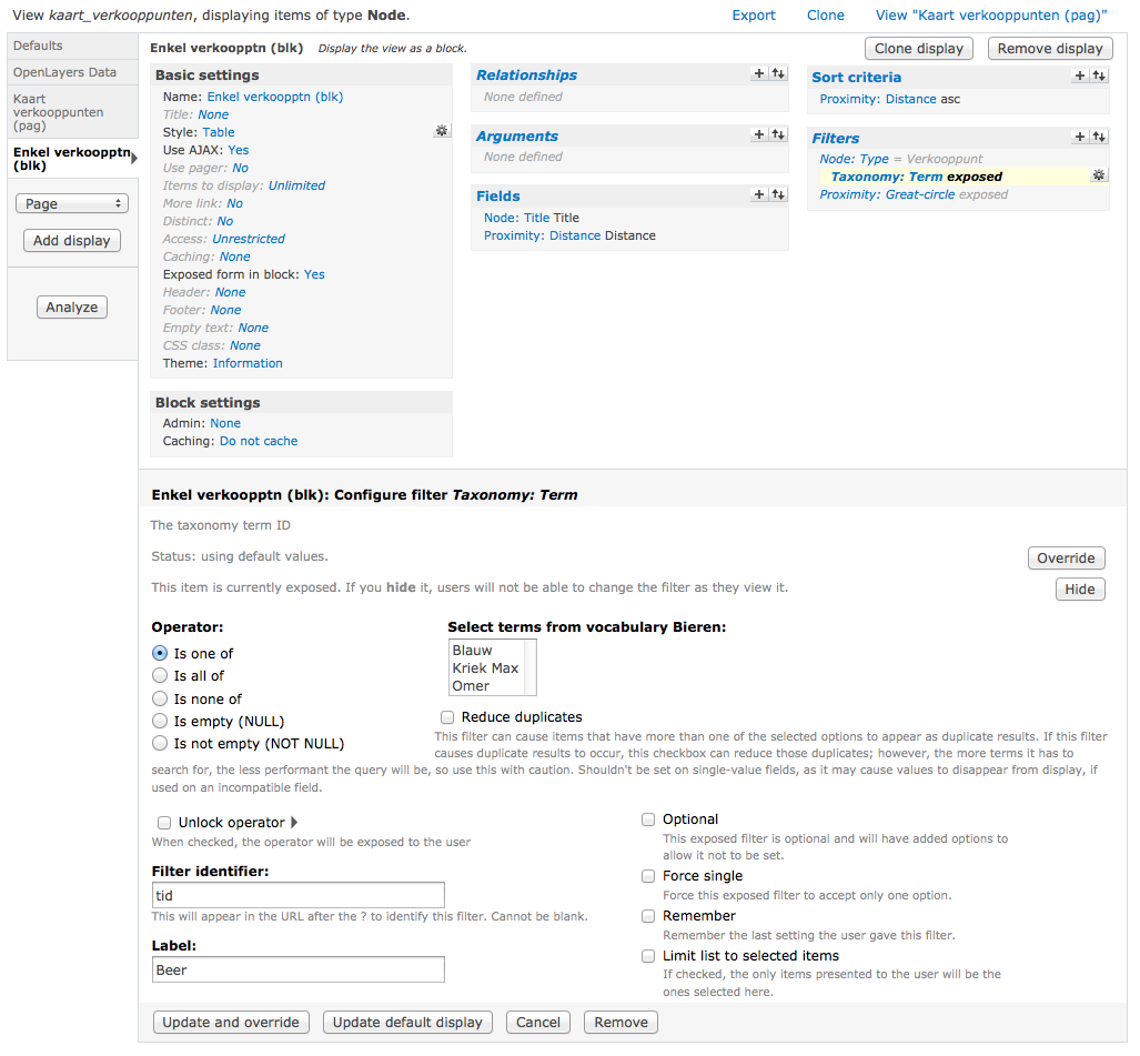 Also notice in the above screenshot that I'm using an extra taxonomy filter, called "Beer". This is linked to a vocabulary with several beer products which are offered by dealers all over Belgium. This way visitors can find (filter) out where a certain type of beer can be purchased throughout the country, and the they can filter these results with a proximity filter as well.