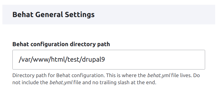 a. Make sure the full path to your project for Behat configuration directory path field has the following value /var/www/html/test/drupal9.