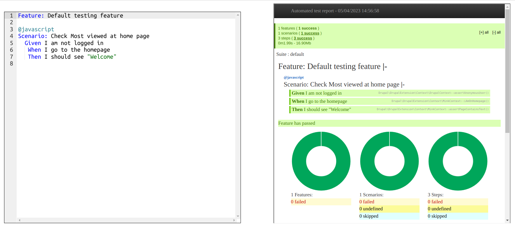 behat.yml- This file contains the configuration settings for Behat tests.features/- This folder contains the feature files that describe the test scenarios.features/reports/- This folder will store the HTML test reports generated by Behat.features/logs/- This folder will store the log files generated during the test execution.