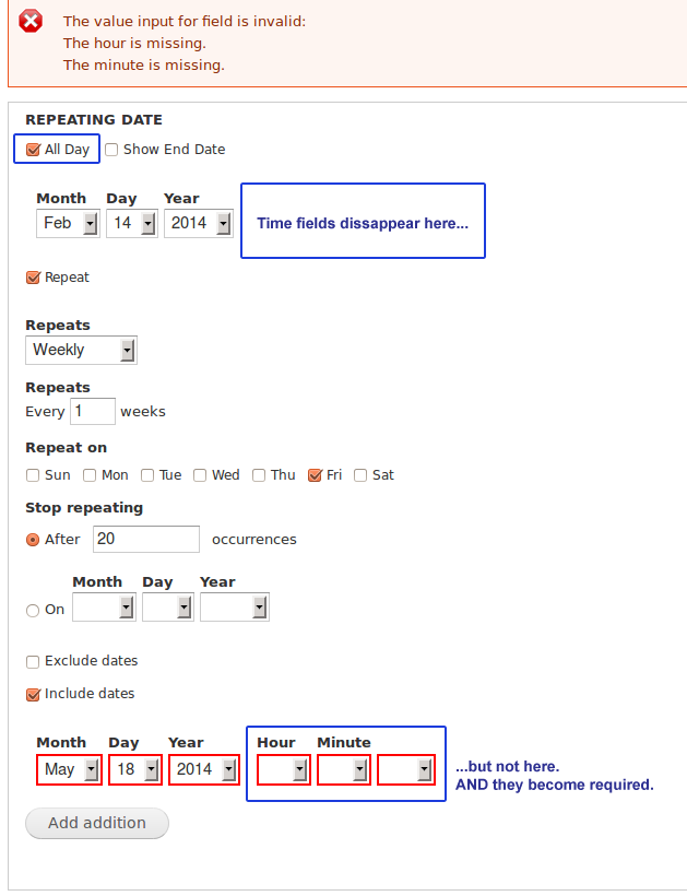 chrisloos commentedWe're experiencing the same issue. Our client is making heavy use of the Additional field for repeating dates in the content they've uploaded so far, and this bug is really screwing up our calendar list view. The list is grouped by day, and the repeating events that use the Additional field are showing up in their own day group, instead of being listed with the other events in that day, and are being listed as "All day" instead of at the correct time.