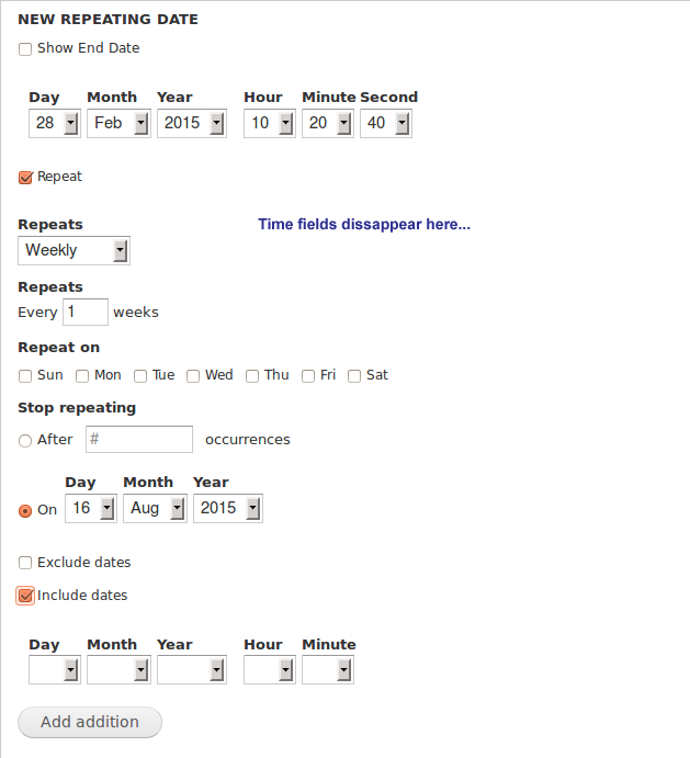 And another "needswork": Include dates does have a timefield now, but Exclude dates does not.(edit: exclude dates don't need a time, they exclude all day ;-)Comment #107
