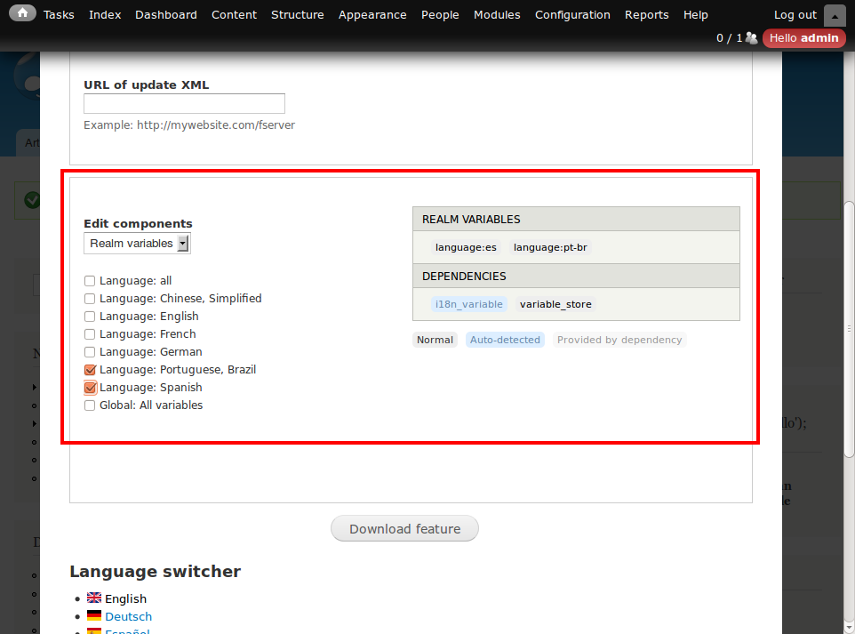 RAWDESK commentedI've tried to feature export/import the bilingual variable site_slogan using this added functional support for strongarm module, but my efforts have been unsuccessful until now.