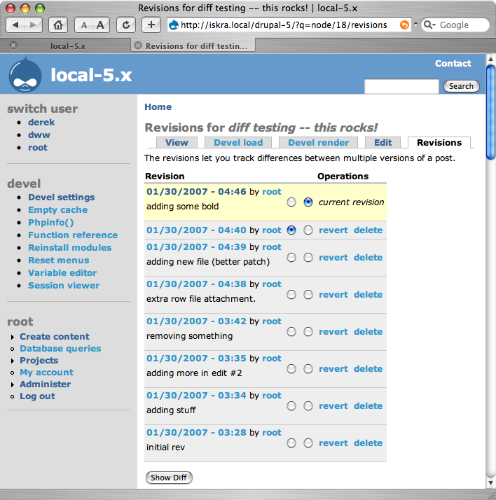 dwwjust since rDouglass is too lazy to install this for himself ;) i'm posting a screen shot of the diff view which spans a few revisions, and shows off some of the coolness of node.inc and upload.inc...