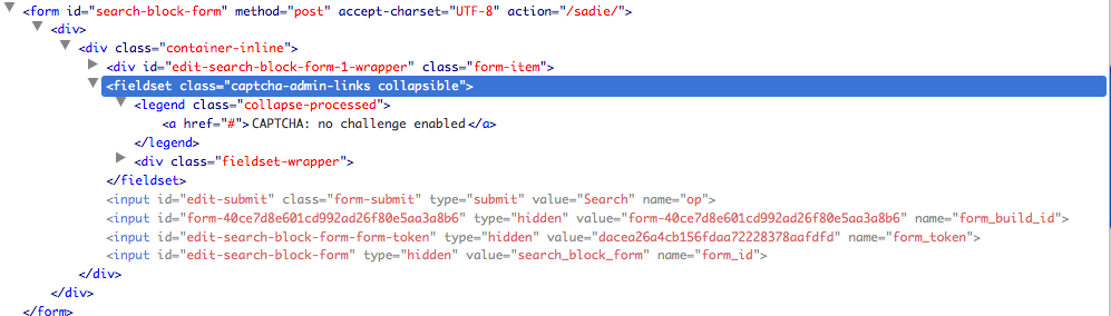 I understand that this is by design, but without the fieldset classed out, themers cannot hide this when it appears in areas of a theme it shouldn't. For example, any custom search block added to the header area of a theme, will automatically get this captcha option.. and to disable it, a themer must hide all fieldsets in that region.. if there were a class added to the fieldset, we could easily just hide that captcha fieldsets in whatever areas are undesirable.