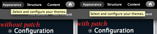 Here a screenshot of the title attribute. These characters aren't printed by webbrowsers, but they are send to the browser and not filtered by Drupal functions as check_plain afaik. Attached a screenshot of the title attribute of the menu correct with and incorrect without this patch (rtl language chosen, without translated strings).