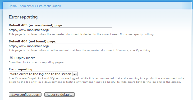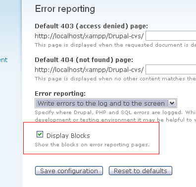 robloachThe "Display Blocks" option is something that should be present in the error reporting administration interface, as requiring someone to write code for doing this can be a bit overkill. This also makes it impossible to show the blocks in Garland, Minnelli, or any other core theme without making an entirely new sub-theme, and then adding the code block.