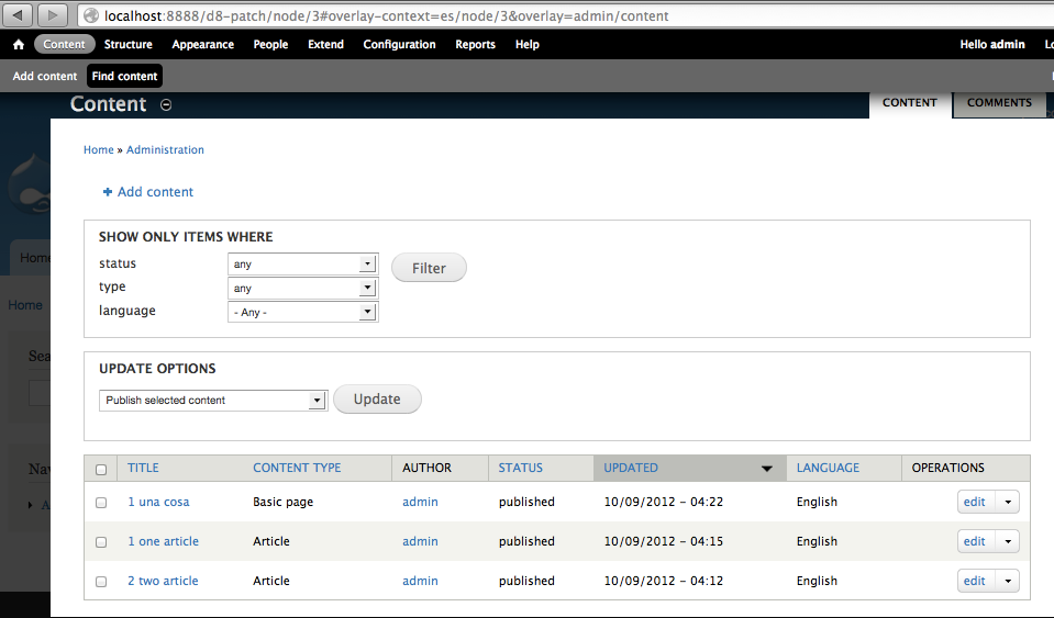 yesct commentedI reviewed the new stuff. The new tests are great, very readable. I checked them for api docs, and basic code readability. I also manually test most things and translation of users, terms, nodes, comments is working.