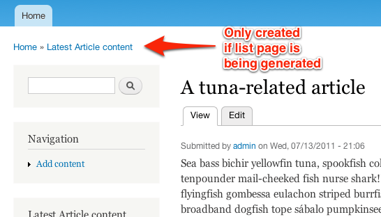 Two details that probably need loving. First, the menu path (/content/$typename) is a bit crap, since there's no /content url. Ideally, we'd use something other than /node for the promoted content listing page, and we could have that be the top-level path. We'll see. Second, when you choose to enable a listing page for a given type right now, it also inserts the listing page into the breadcrumb trail when content of that type is being displayed. Should that be part of the behavior? I'm not sure, but providing it as a default when the listing page is activated certainly simplifies the creation of a nicely built-out site.