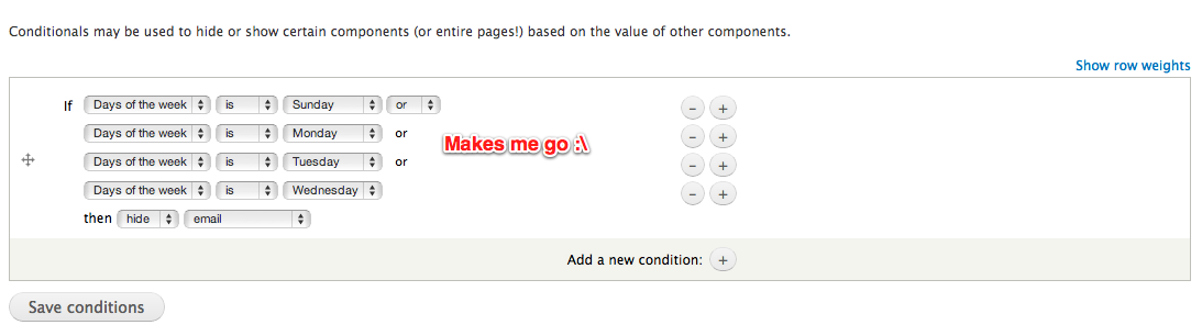 quicksketchHere's a screencast of the system in progress. Right now I have the UI working with all it's AJAX and JavaScript goodness, as well as conditionals saving and loading into/from the Webform nodes. It doesn't yet actually affect the display of components yet, provide an upgrade path, or work on same page components (all of which I'd like to get handled in this issue).