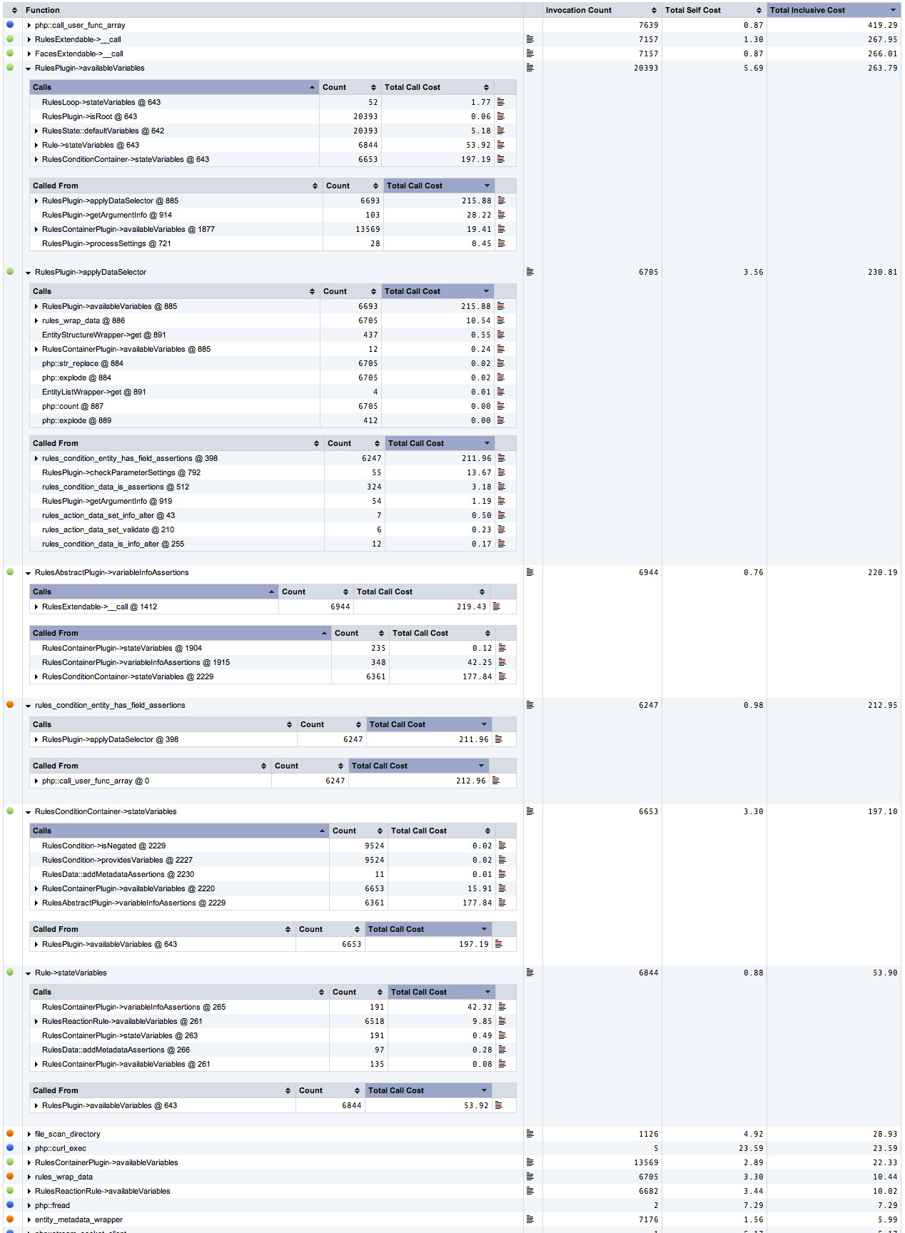 mrfelton commentedHere is a better screenshot that shows more clearly where all of the time (and hence probably memory too) is being spent. All of these Rules related functions are the most expensive in the site. It seems it spends a lot of times trying to get the available variables over and over again.