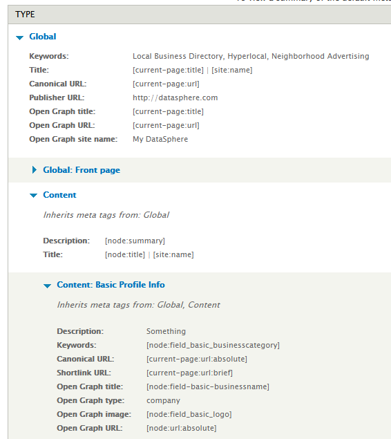 When I go the a piece of content, I am getting the meta tags defined in the "Global" fieldset, but the items defined in the "Content: Basic Profile Info" fieldset do not. For example, I have hard-coded the word "Something" to appear, but it still won't.