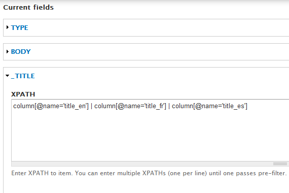 Now add just one field _title with the following xpath column[@name='title_en'] | column[@name='title_fr'] | column[@name='title_es']