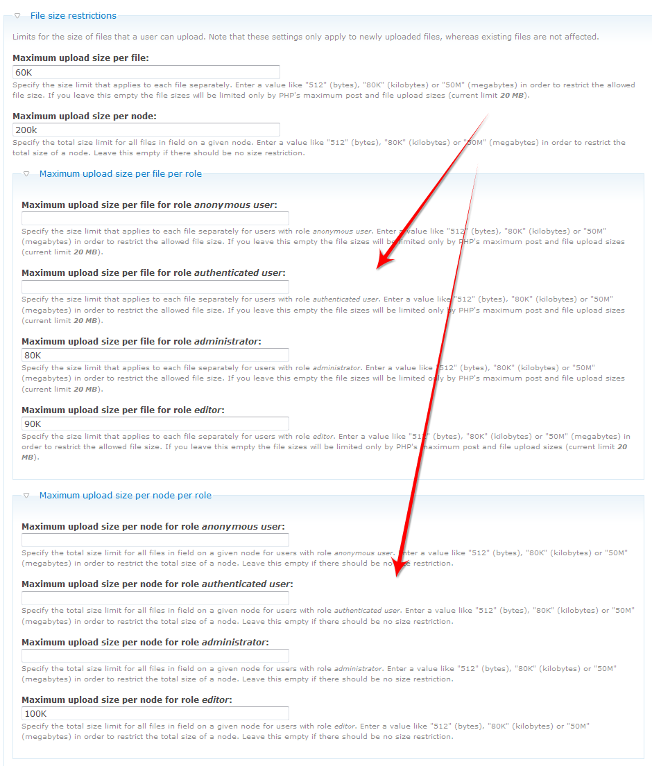 - I didn't configure 'Maximum upload size per file', but configured 'Maximum upload size per file per role' and set it to '10K' for authenticated users.