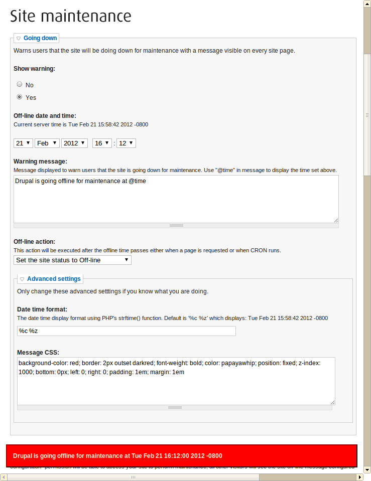 A module that warns site visitors that the web site will be going down for maintenance at a specified time. The default configuration displays a fixed position red overlay message at the bottom of the browser window with text in the format 'Drupal is going offline for maintenance at Tue Feb 21 14:41:08 2012 -0800'. Module configuration is added to the Site Maintenance administration page (admin/settings/site-maintenance). Settings allow for the modification of: Show warning, off-line date and time, warning message, and off-line action. Off-line action includes an option to set the site offline automatically. There are also advanced settings that control the display format of the date time and warning message.