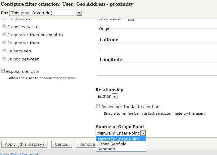 IWasBornToWin commentedLook at #4 in this post. geofield already has a funtion in views to calculate distance but only if you manually enter latitude and longitude. Where the dropdown says "Manually enter point" I need to be able to choose "Logged in user" and then have code that grabs the user's point instead of having to manually enter.