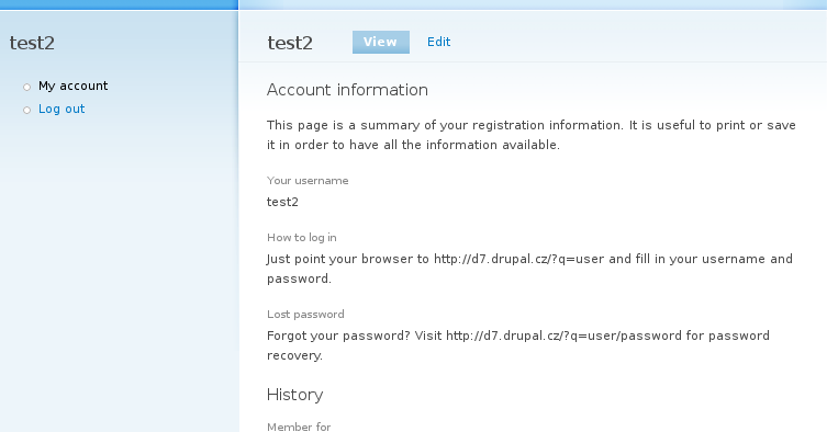 I used new a approach and displayed registration information directly on user account page. This page is too lightweight now I think, displaying "History: Member for..." is just useless.