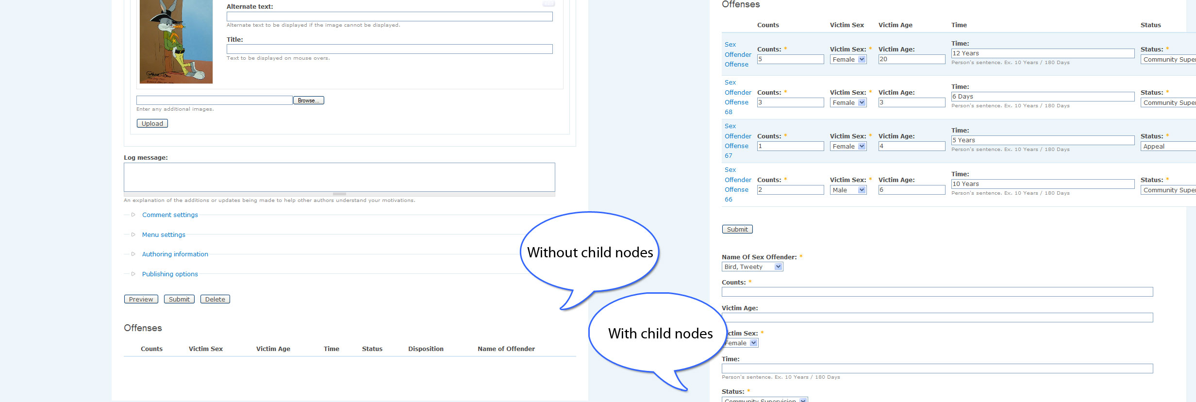 - I also want to list all the offenses a criminal has committed on the criminal's node page. (I am able to do this)