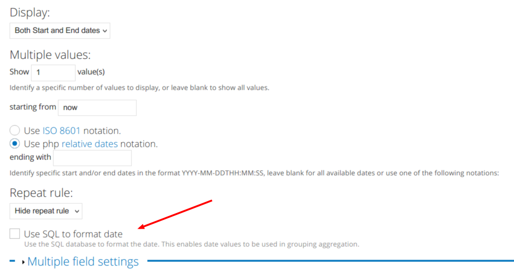 For others who stumble onto this post: If you don't see a check box for "Use SQL to format date" when you configure the date field in your view, make sure you use the -dev branch of the module. Then, if using a Sort for your date field breaks the aggregation, use the tip in #26 and set the aggregation to "Minimum" instead of "Group results together."