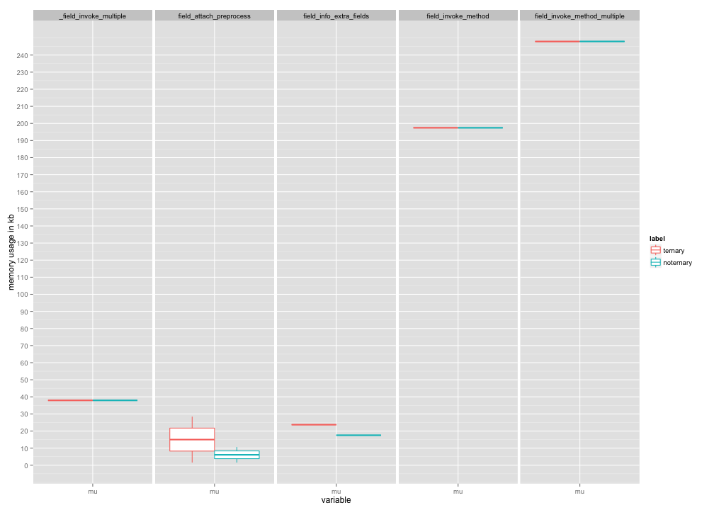 msonnabaum commentedPosting it here since I think it's more relevant to this issue, but I profiled the before and after of the fields patch which removes ternaries.