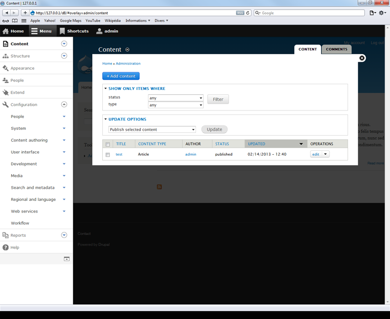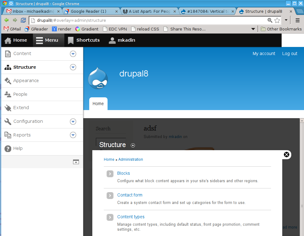 damontgomery commentedI'm having a similar issue here. Please see my screenshots. This is on Chrome for Mac. This does NOT happen in Firefox on Mac. This is a fresh install of d8-dev from today, Jun 4, 2013. If this was the wrong issue, sorry, I couldn't find another that seemed more related.
