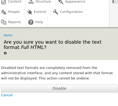 with overlay: #overlay=admin/config/content/formats/full_html/disable