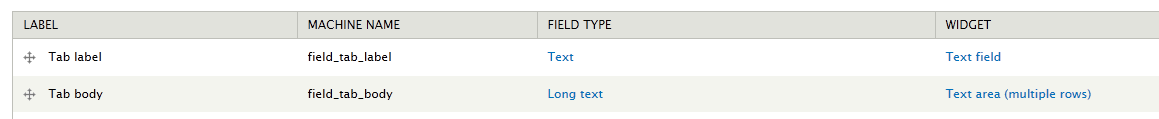 The field collection can contain any number of fields, but the module only supports the display of two: a label, and a body. These two fields can be of any type (they are run through the Drupal render system), but a text type is recommended for the tab label.