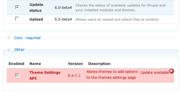 b) I was also expecting that when I checked out themesettingsapi 6.x-1.0 from CVS it would show up red. It didn't. This is because the module's version is not defined, but once I installed cvs_deploy module it worked as expected.