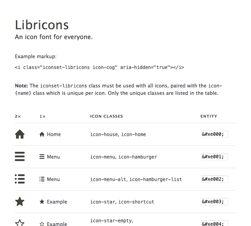 <span class="libricons-home"></span>. However, if I needed a variant of the base style, say to adjust alignment with lowercase type, I would have to do something like.libricons--lowercasebut that’s wrong because there is no base class (.libricons) present. If I instead use.libricons-lowercasethen that’s indistinguishable from the class you’d use for an icon called “lowercase”. Also, regex selectors are relatively slow.With the current Libricons CSS, you can do