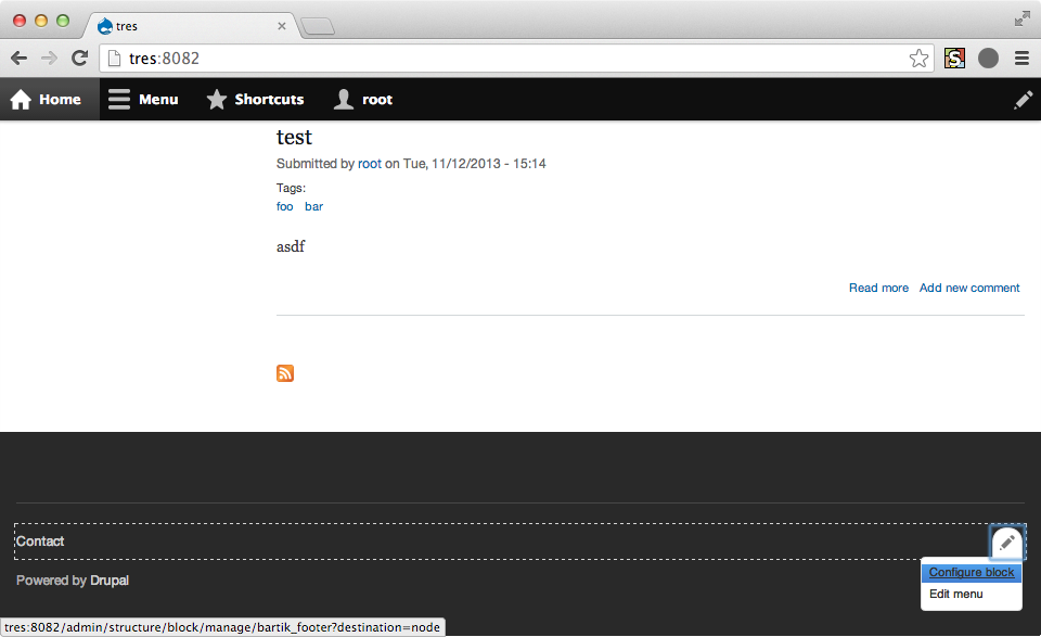 #footer-wrapper a { color: something }statement, which has a higher specificity than.contextual-region .contextual .contextual-links a { color: something }because of the ID.Conclusion: Bartik should not use an ID, or at the very least, it should not target an extremely generic element such as
