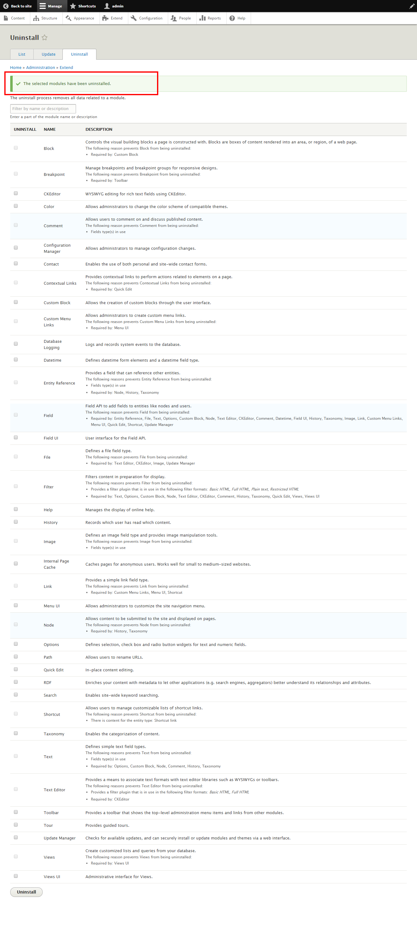 tr commentedWell, I can change that message on the uninstall page, but it's not part of what we originally set out to do. (See the issue summary). We could go on forever adding "just one more" improvement, but I'd rather not have to keep rolling a new patch every day just to add one more little thing. This issue is already trying to tackle way too many different problems at one time. I think the patch already does everything it's supposed to do, as per the issue summary.