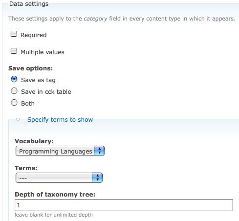 Installation and usage are relatively easy. Upon enabling, Taxonomy Fields would be available on the "Add field" page for a content type, depending on what widget modules you enabled. Once they are added, they replace existing fields provided by the Taxonomy module. Unfortunately, there is a funky reciprocal relationship problem; a vocabulary is normally limited to a few content types (or only one), but Content Taxonomy lets you choose any vocabulary to be added on to as a CCK field. It should respect Taxonomy settings and only let users choose a vocabulary that is meant for the content type they're configuring. Thus a user has to be careful to make sure that this vocabulary-content type relationship is valid in both ways. This is perhaps the only logical problem for Content Taxonomy. Aside from that, users can choose the depth of the taxonomy tree displayed (it can be unlimited), specific terms to be displayed (if the vocabulary is a tree), whether not it's required, whether not multiple values are allowed, default values, where the taxonomy information is stored (as a tag, in CCK table, or both), and etc. In other words, Content Taxonomy replicates some of core Taxonomy's functionality. It should simply honor the settings set in core Taxonomy.