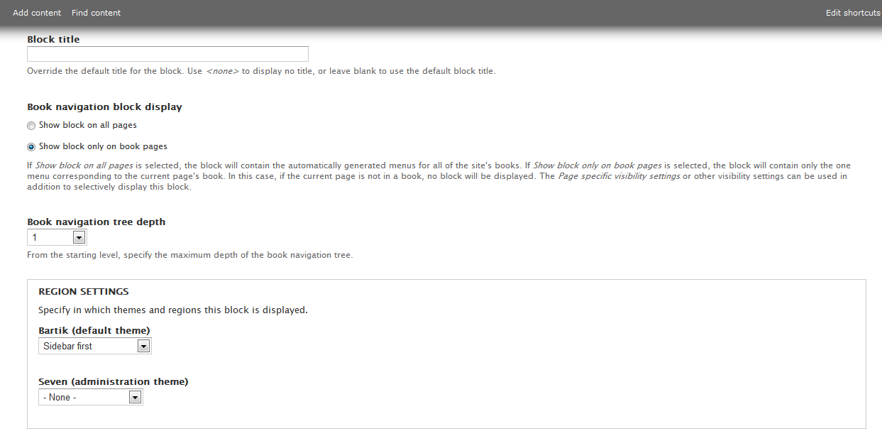 User can set the display of book block and expand depth level of tree from block configuration page. This is helpful for set default expand level of book tree.