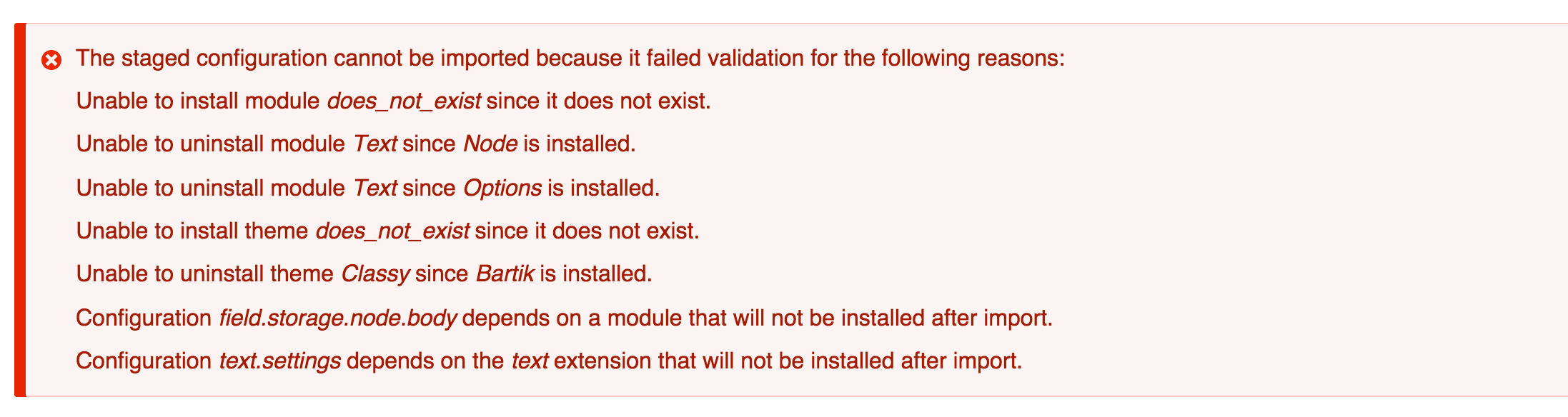 The new message also doesn't really tell the user what this means nor how to deal with it, so I think we could do some work to improve that as well. When I first read "will not exist after import", at first I thought "So what? Isn't that the point of doing an import?" (I'm assuming the message is this way now because the missing dependency could either be a difference between the current site and the staged config, or an internal inconsistency within the staged config, and we can't really tell which it is.)
