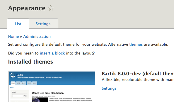 David_Rothstein commented@Bojhan so there wouldn't be duplication on the page (since each link would go to the block configuration page for that particular theme). There would be duplication with the other path for getting to these pages (via Admin >> Structure). Depending on how strong the usability testing results were (i.e. what percentage of people went to "Appearance" first?) I honestly wonder if it would make sense to just remove block configuration from the Structure menu and have Appearance be the one and only place you go to do it? (It is not a wrong instinct to go there; in many ways it makes more sense than Structure.) That would be a larger change, though.