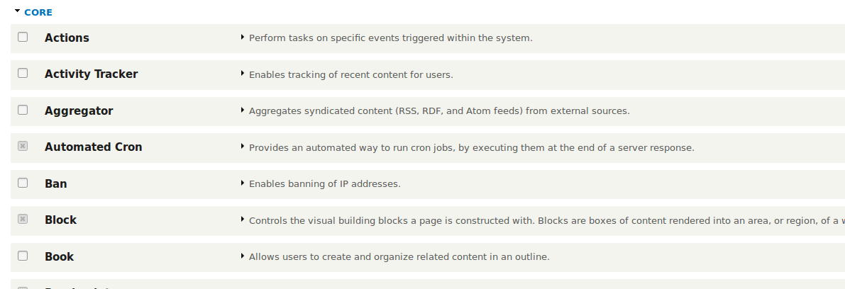 Actions, Aggregator, Ban, HTTP Basic Authentication, Custom Block, Breakpoint, Color, Comment, Configuration Manager, Configuration Translation, Contact, Content Translation, Contextual Links, Database Logging, Internal Dynamic Page Cache, Field UI, File, Image, Field types, Multilingual, Custom Menu Links, Internal Page Cache, Search, Tour, Views UI,