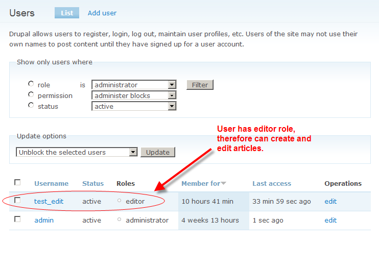 So seems like the right roles are returned, but test_edit can only create and edit articles, and does not have the ability to publish articles or use Drupal's revision process. See the other attached file for a listing of the current Access Control layout.