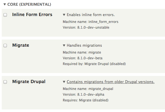 - Drupal 8 core introduces the concept of "experimental modules" that are not completely production-ready but that are included in core for testing.