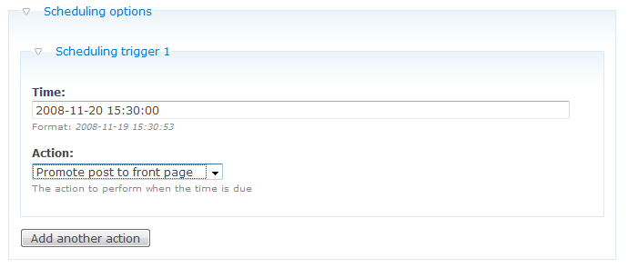Now this is what happens: A time entry widget will be inserted in every node form for the user to supply a publish date/time. If the user saves a new node the scheduler_publish_action will be executed which checks if a time was set and writes an scheduler entry to the database. Scheduler will check during cron runs if any triggers need to be fired. If the publish time of a scheduled node is past due the scheduler_publish_trigger will be fired which will execute the "publish node" action.