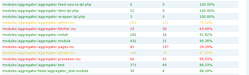 berdir@alex_b: I tried to focus on testing functions inside the file aggregator.module. That mainly includes hooks (especially block), api functions and also the sanitize function.