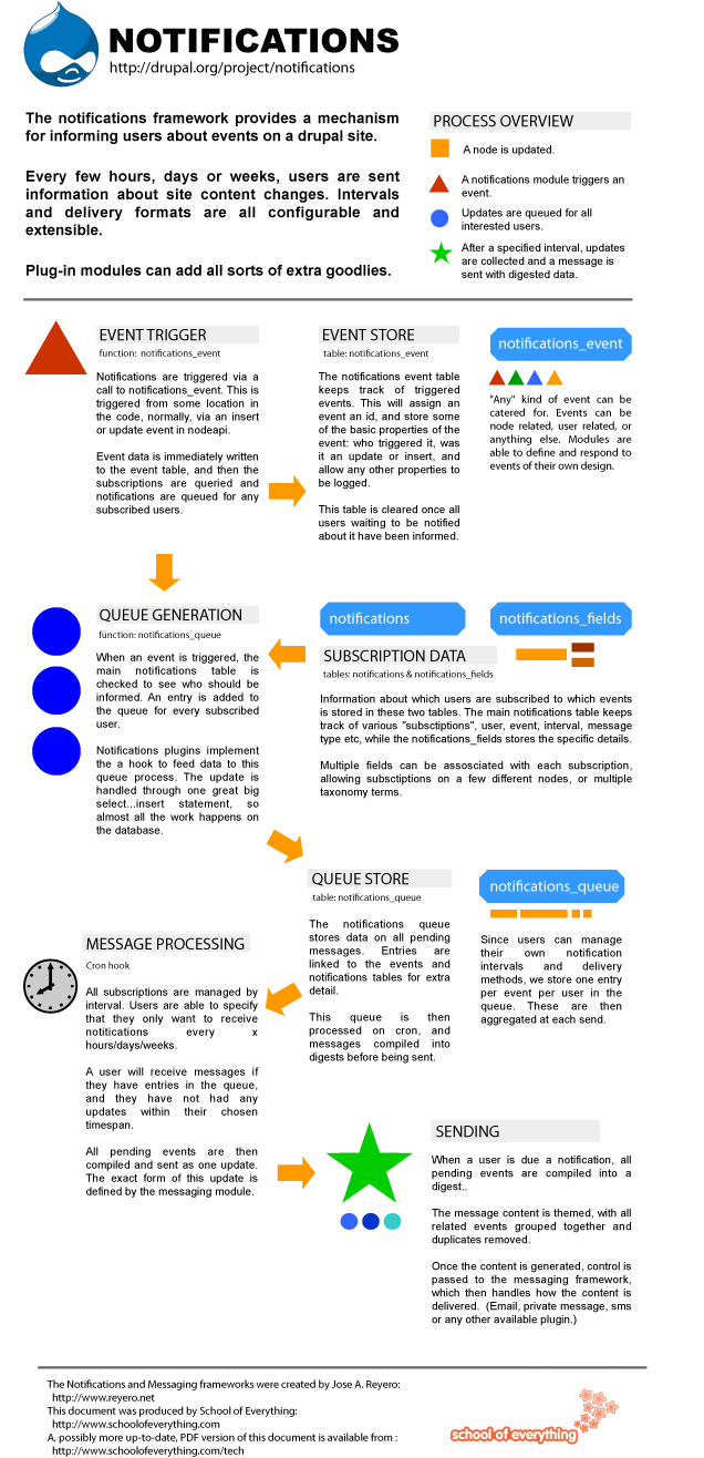 We have produced some more documentation on notifications, in the hope that we can get more people making use of this great framework. At the moment, School of Everything is built on Drupal 5, and so we are not really able to build versions for 6. There are all sorts of ways that this project could move forward and we would love to find some collaborators.