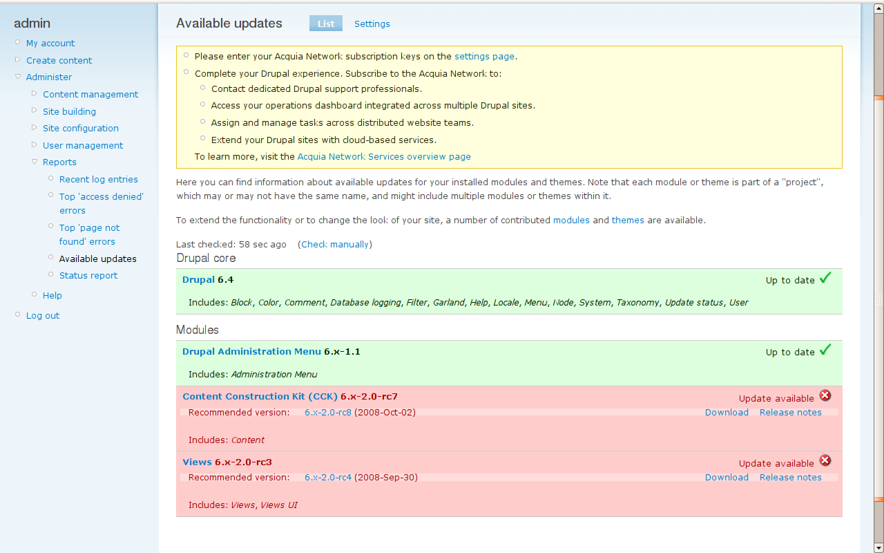 More screenshots of Acquia update notifications