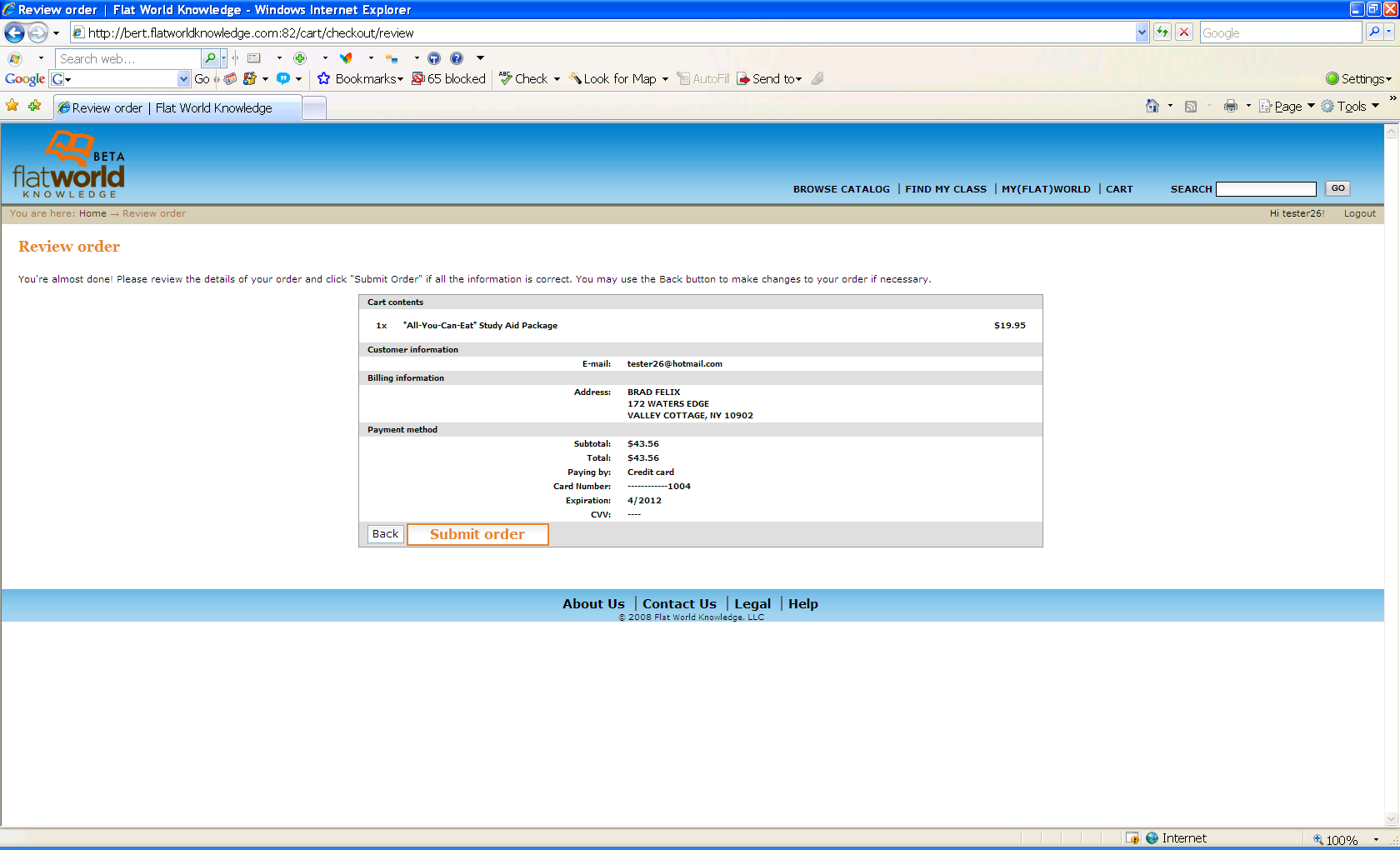 The product kit in question is listed as being $19.95. It includes 45 items that all cost $0.99 each. Within the edit menu for the product kit, all of them are left at the price $0.99 except for one, which is discounted by $-24.60. So, it computes the price correctly to $19.95 (45*.99 - 24.6 = 19.95). I add it into the my shopping cart and the price is still listed correctly. But, when I checkout using Credit Card, just before I submit the order, it tells me that the total is $43.56. It isn't charging the price of the product kit for some reason. It seems to be computing the price in a different way.