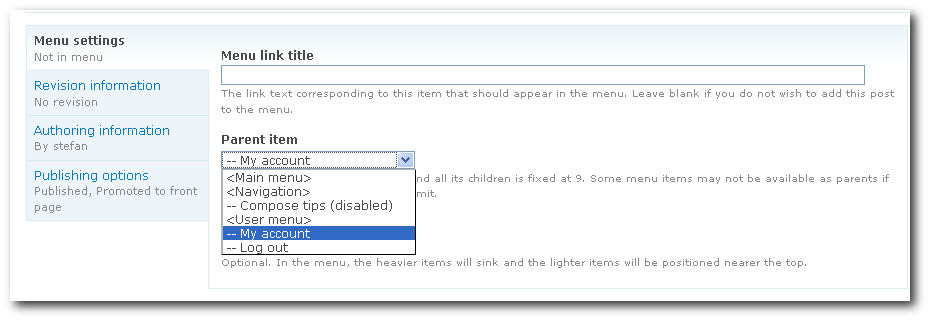 karens commentedNote that if we combine this with #273137: Split Navigation to User and Administration menu, we could then also set things up out of the box so that the administrative menu items don't show up as available parents when creating story and page nodes. Seeing all those admin items as options confused the heck out of people in the usability testing, so that would be a big win. Has anyone EVER added a story or page to the admin area? I sure haven't, but you have to stumble over all those options every time.